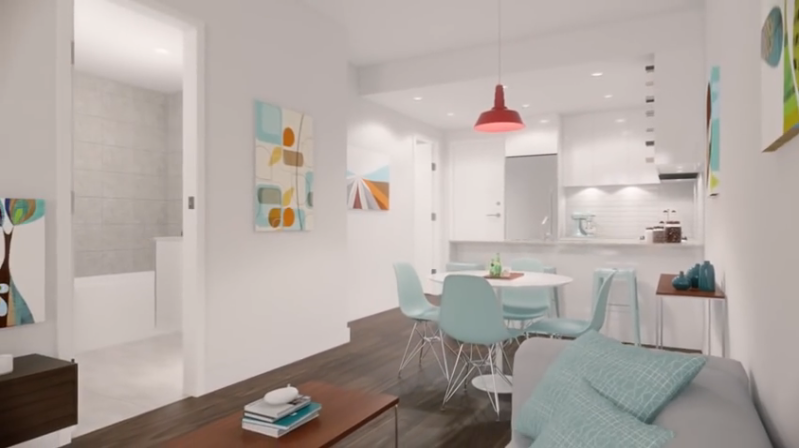 - Over-height entry with dramatic lighting, finishes and reclaimed hardwood flooring from the former Carpenters’ Union Hall